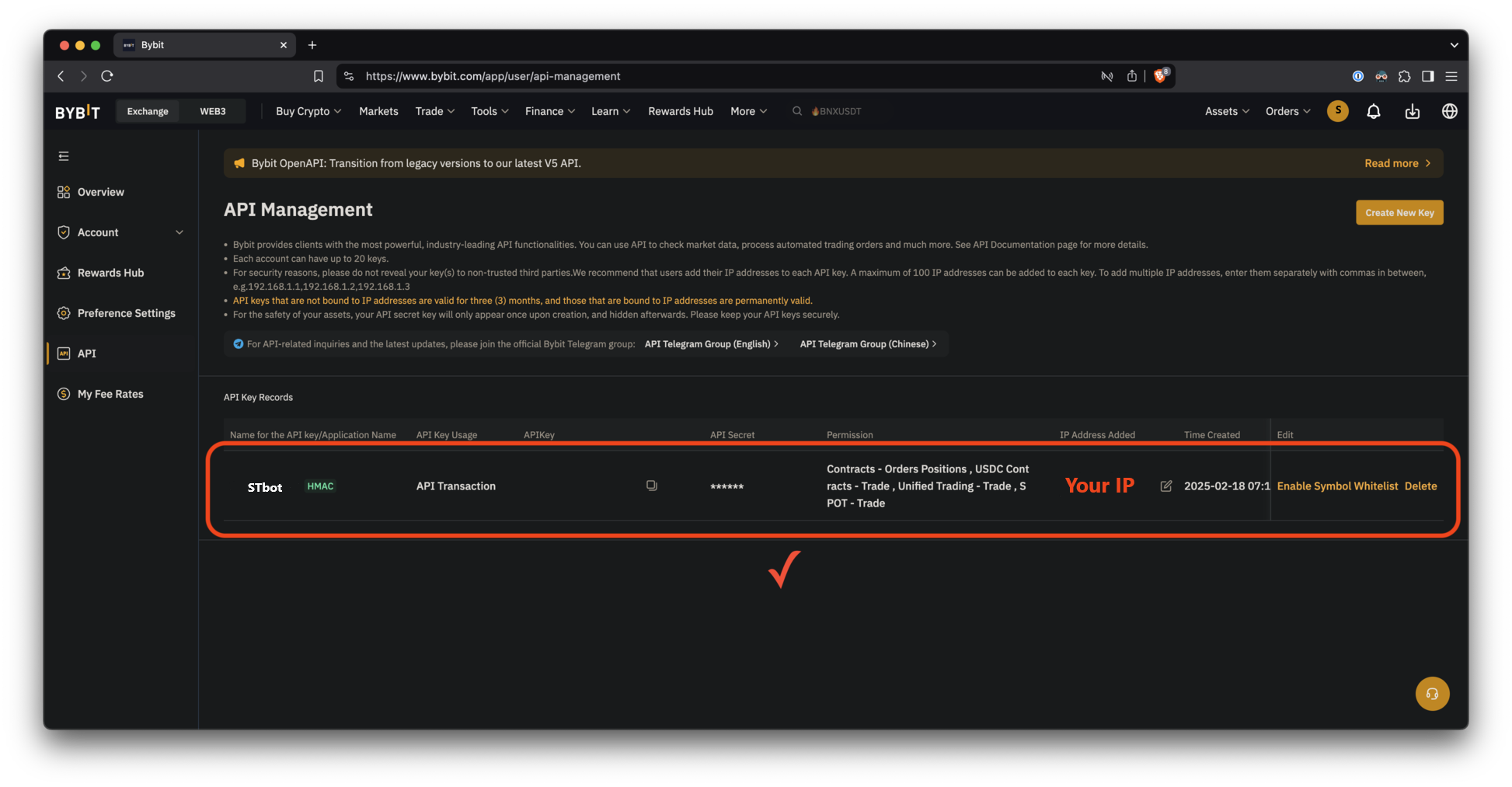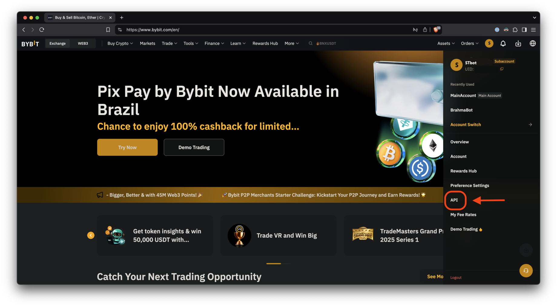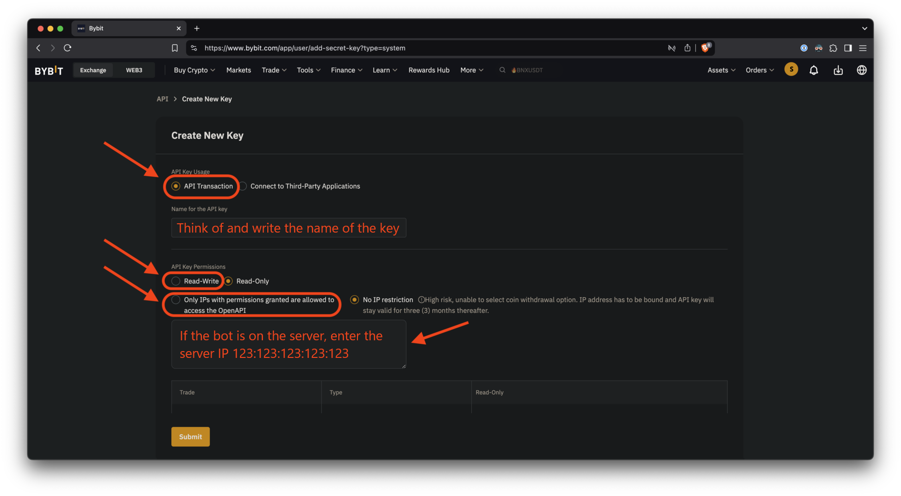 Very important! Demo API keys are created in the DEMO Trading section on the Bybit exchange, and they are different from the API keys for real trading. When demo trading is enabled in the bot, the API keys must be demo keys!