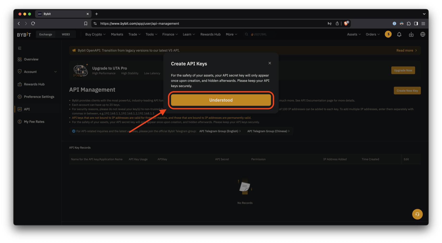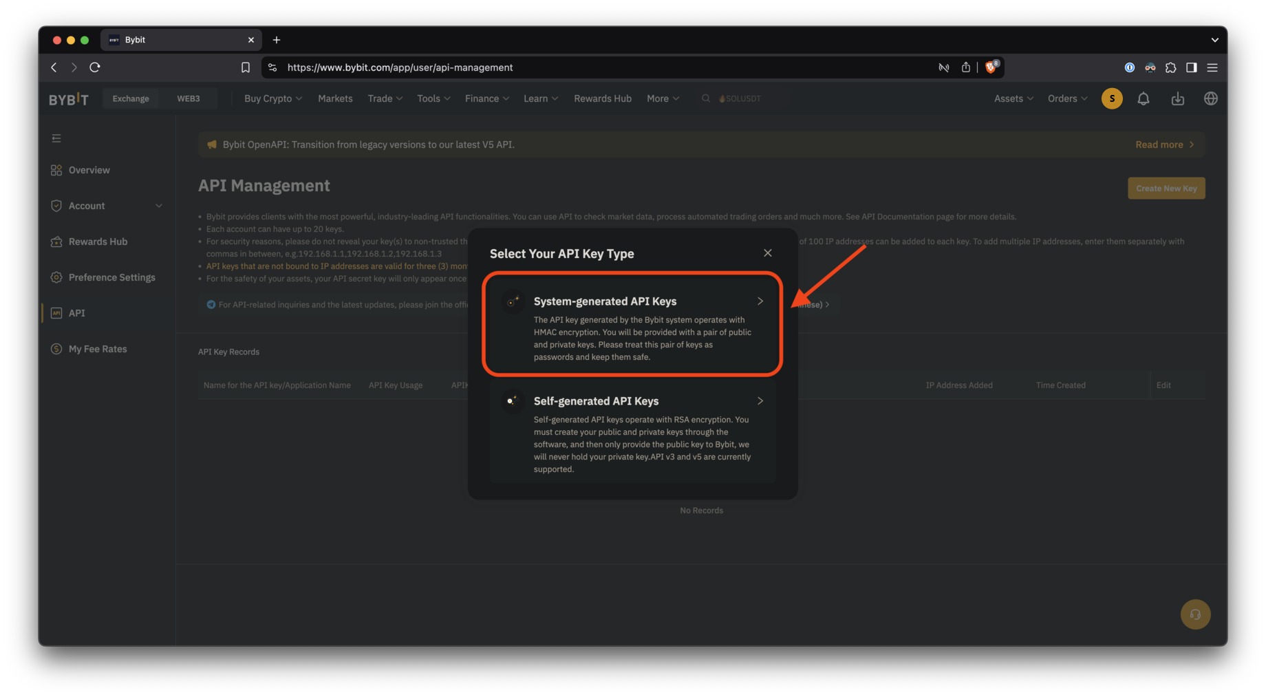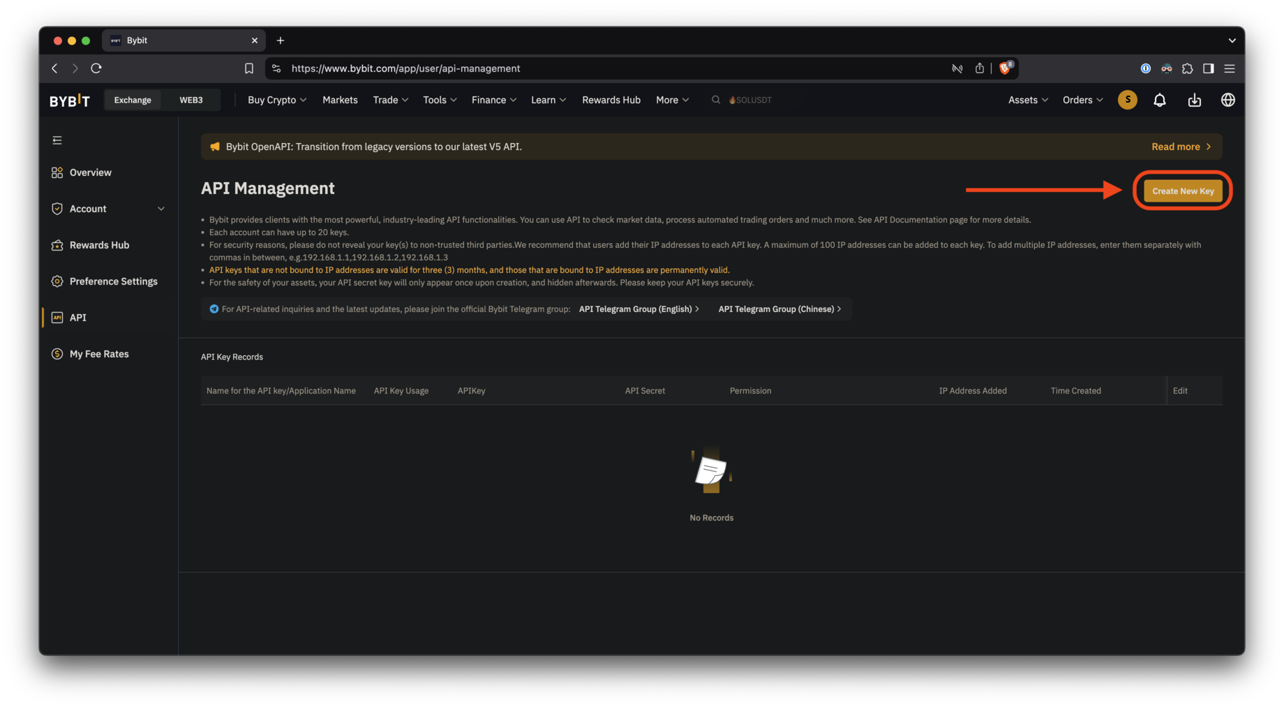 Now go back to the API creation page from step 4 and click “Create a new key”.