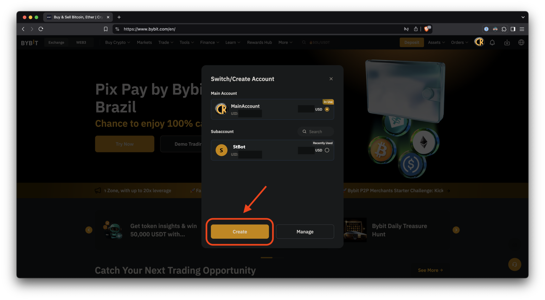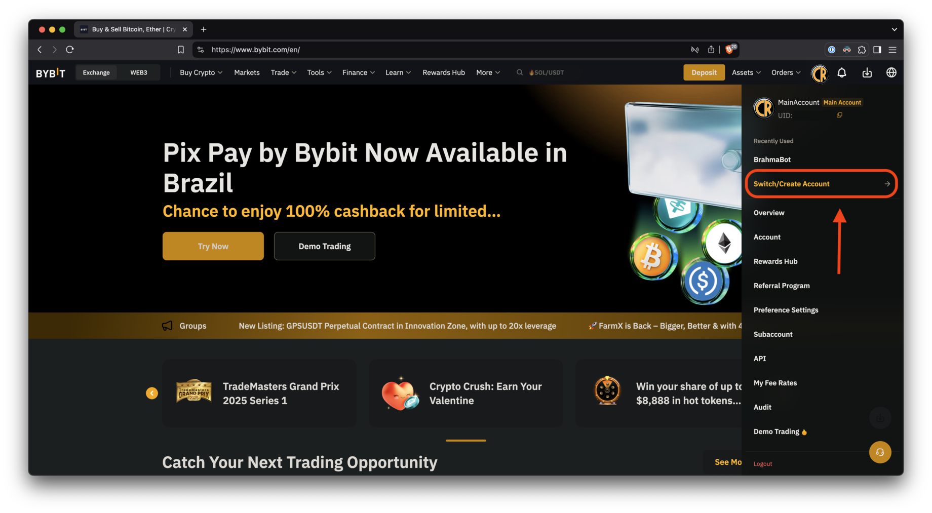 Click the “Switch/Create Account” button to see the sub-accounts.