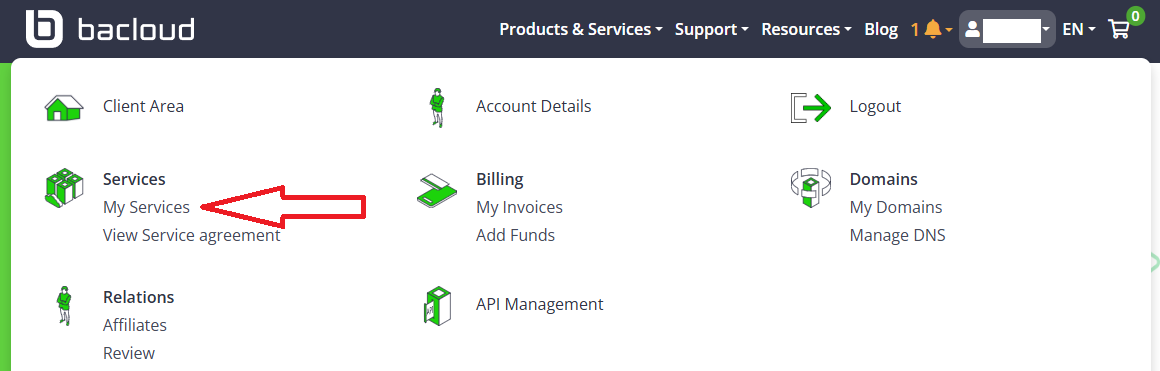 After payment and activation, in Bacloud move your cursor over your profile and go to:
