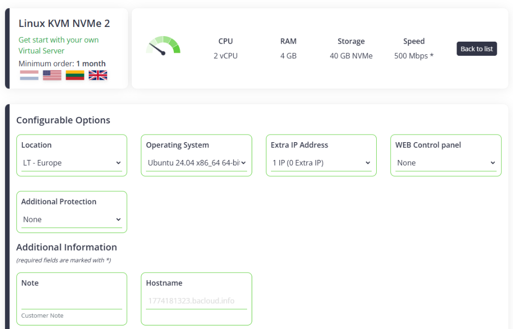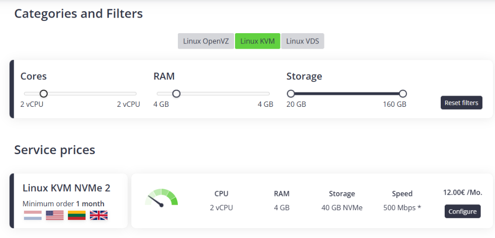 2 vCPU4 GBYou will see the Linux KVM NVMe 2 — 12 €/month plan. Click Configure.