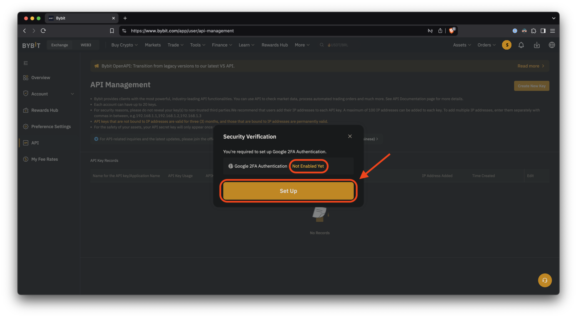 Если вы не настроили 2FA, Bybit попросит вас сделать это, прежде чем продолжить.