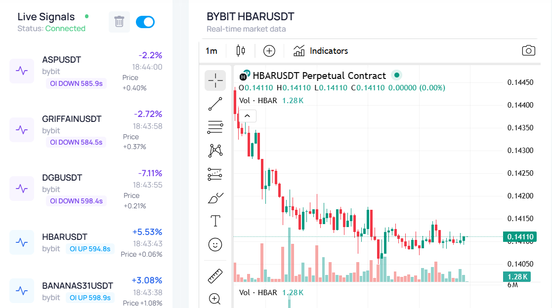 Скринеры фиксируют резкие изменения цены, OI или ликвидации и выводят готовый сигнал в панель Live Signals.