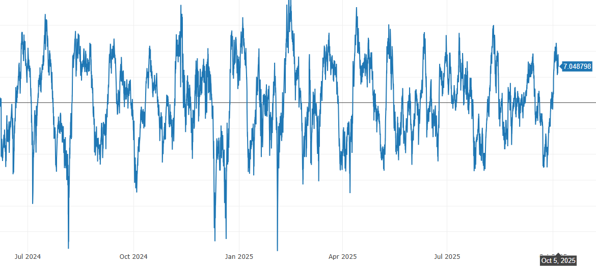 Сводный показатель «температуры» альт-рынка на таймфрейме 30 минут. Отражает, где в среднем находятся цены альткоинов относительно середин своих регрессионных каналов за последний исторический отрезок.